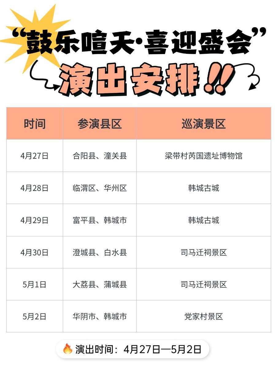 “五一”假期将至,一场融合非遗锣鼓、黄河文化、文旅展销于一体的盛宴即将在韩城市开启。据了解,“我要上省运·鼓韵耀渭南”2026渭南市锣鼓展演暨文旅融合展销活动将于4月27日至5月3日在韩城市启幕,此次活动以鼓为媒、以节兴旅,全面营造喜迎省十八运的热烈氛围,推动文旅深度融合,激活假日消费新活力。