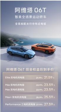 2026年4月22日(北京),阿维塔科技宣布,智美全场景运动轿车——阿维塔06T正式上市,官方售价区间为21.99万元-27.99万元,限时权益后到手价21.59万元-27.59万元。阿维塔06T共推出纯电、增程两种动力五款车型,凭借“6T产品价值”成为年轻人的第一台性能车。即日起,用户可通过阿维塔App、阿维塔官网、阿维塔小程序以及全国各大城市的门店等官方渠道进行订购,上市即交付。