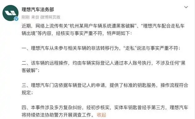 4月22日,理想汽车法务部发布声明:近期,网络上流传有关“杭州某用户车辆系统遭黑客破解”、“理想汽车配合走私车辆出境”等内容,经核实与事实严重不符,特声明如下: